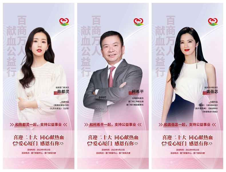【廈門晚報】9月22日,由市工商聯(lián)(總商會)發(fā)起,并聯(lián)合廈門市中心血站、廈門恒興集團主辦的“百商萬人獻血公益行”活動,將在廈門財富中心和寶拓大廈同時舉辦。近日,迪麗熱巴、陳都靈、龔蓓苾、洪浚嘉、于曉光等影視演員紛紛為廈門這一公益活動發(fā)聲,拍攝視頻送上祝福,傳遞“愛心廈門 感恩有你”的正能量,號召愛心志愿者們助力廈門無償獻血公益事業(yè)。
